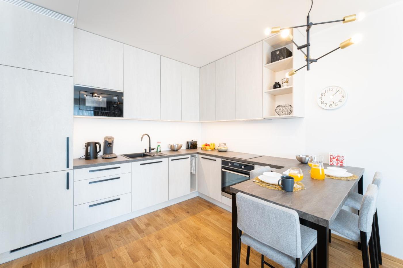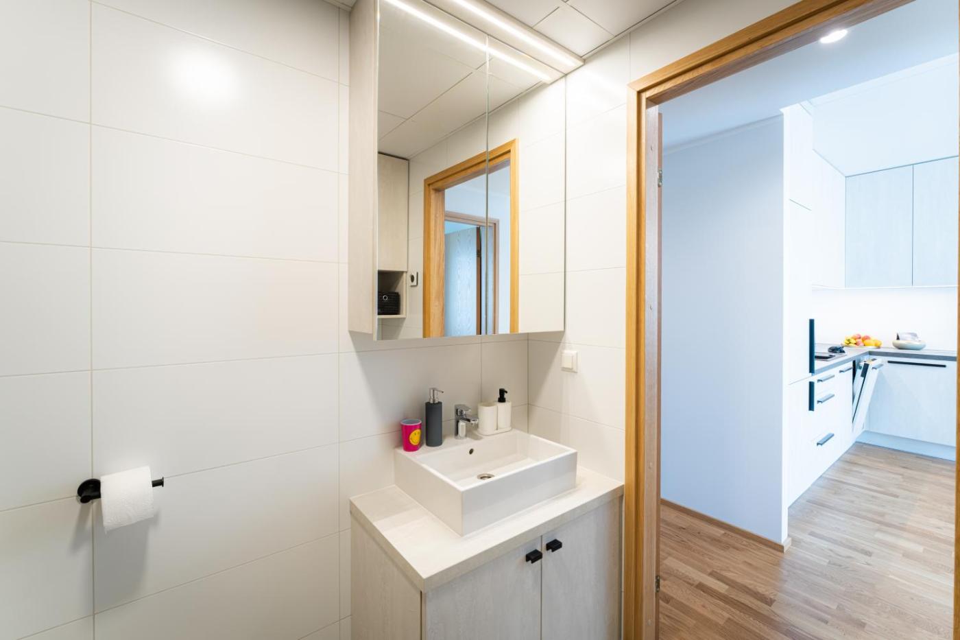 One-Bedroom Apartment. This apartment consists of 1 living room, 1 separate bedroom and 1 bathroom with a walk-in shower and free toiletries. In the well-equipped kitchen, guests will find a stovetop, a refrigerator, a dishwasher and kitchenware. This apartment features a washing machine, soundproof walls, flat-screen TV with streaming services, as well as chocolate for guests. The unit offers 2 beds.