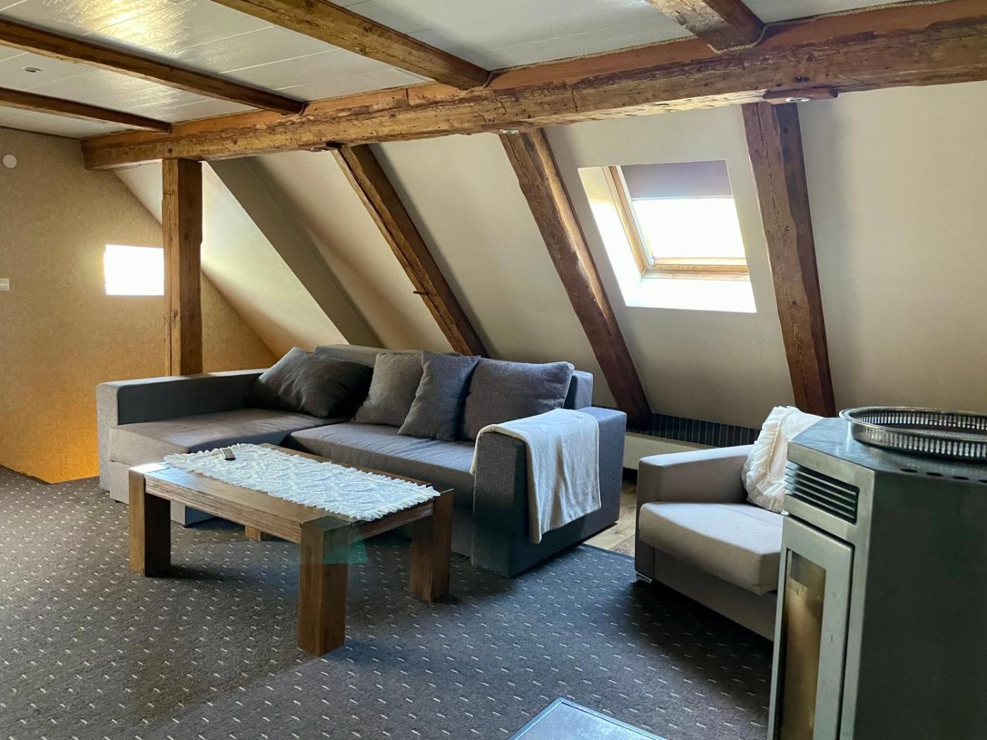 Deluxe Apartment. A spacious, duplex apartment with wooden beams and a fireplace.